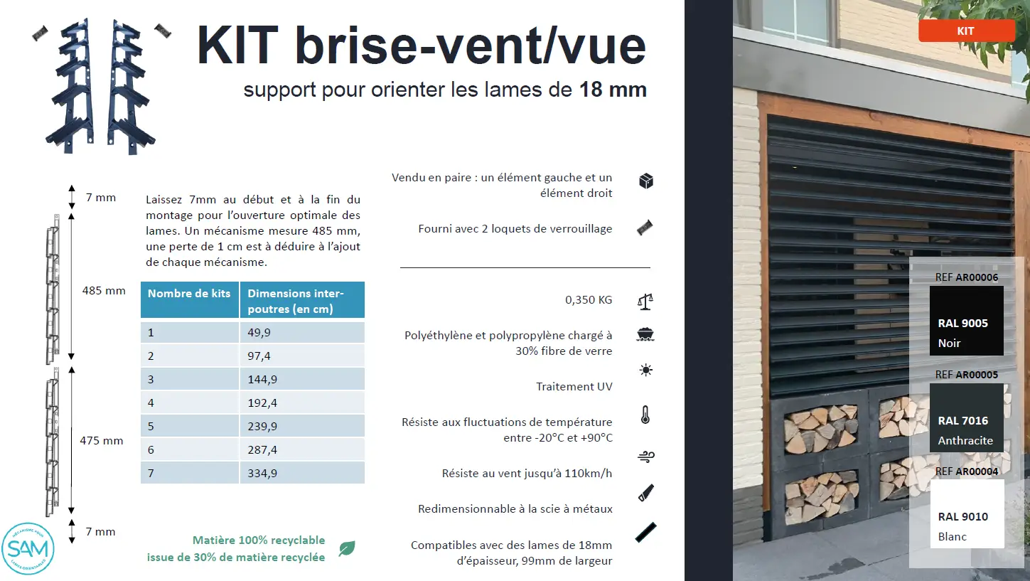 Das SAM-Set ist ein Mechanismus für schwenkbare Lamellen von 18 mm, der für die Herstellung von Wind- und Sichtschutz, Jalousien, Palisaden, Zäunen usw. bestimmt ist. Es deckt eine Höhe von 485 mm ab und wird mit einem manuellen Öffnungssystem mit Stopper verwendet. Um die gewünschte Länge zu erreichen, müssen so viele Kits wie nötig miteinander verbunden werden. Wenn Ihre Länge geringer ist als die des Kits, kann es mit einer Metallsäge gekürzt werden.