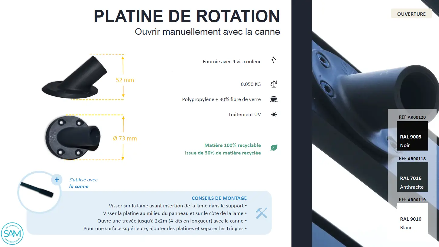 Die Drehplatte ermöglicht das Öffnen der in der Höhe positionierten Lamellen (Dach einer bioklimatischen Pergola).