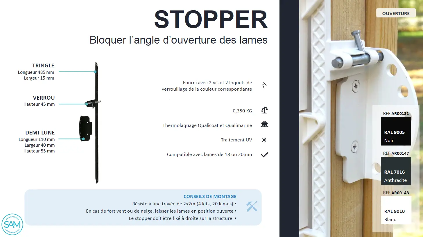 Der Aluminiumstopper ermöglicht es, die Lamellen (7 Positionen) je nach Sonnenstand zu arretieren. Er passt sich an vertikale Strukturen an (Fensterläden, Jalousien, Sichtschutz, Windschutz, Sonnenschutz und Palisaden).